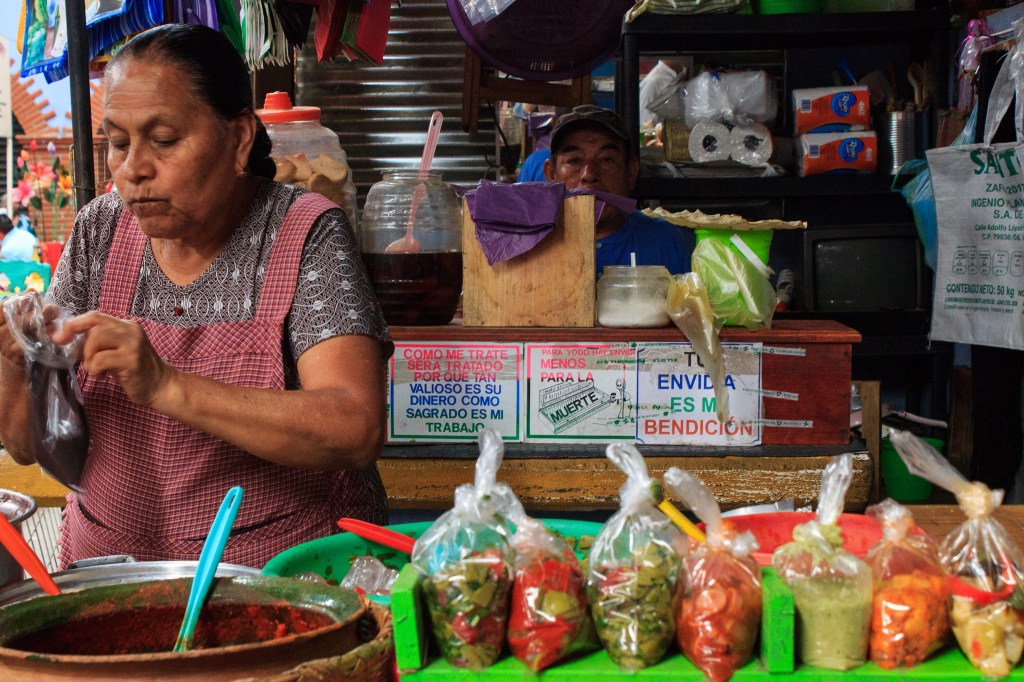 A stream of mobile merchants flows around the diners through the main arteries of the market. They sell pastries, plaits of garlic and, of course, agua fresca straight from plastic bags complete with straws. The choice of flavours induces instant fear of missing out – it will take me more than this holiday to try them all. Beyond the traditional tamarind and agua de jamaica (dried hibiscus flower), the vendors advertise sweet strawberry, refreshing pineapple, comforting coconut as well as the more unusual soursop, prickly pear or alfalfa flower. And they do not skimp on servings here – a regular cup is a whole litre and for a fraction of the price found in the city.