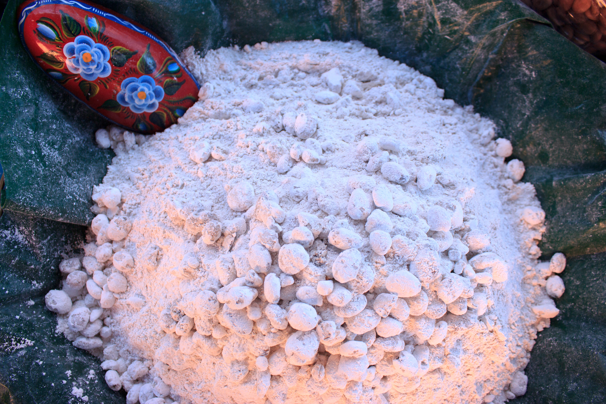 The markets are divided into thematic sections: the clothing area, the butchers, the bakers, the flowers, the grocery, the cocoa vendors, the chapulines friers, the livestock. The central squares in Zaachila and Ocotlán are taken up by pop-up snack and drink bars. In the morning, a strange ritual takes place here: metal creamers are placed in deep barrels of ice and rows upon rows of men spin the creamers all morning chatting to the fellow spinners. These centrifugal vessels are filled with a dizzying variety of colourful liquids and every now and again the men take a break and dip in a wooden spatula breaking up the formed chunks of ice. A few hours later, hand-made ice cream – which the locals simply call nieve, meaning snow – is ready.