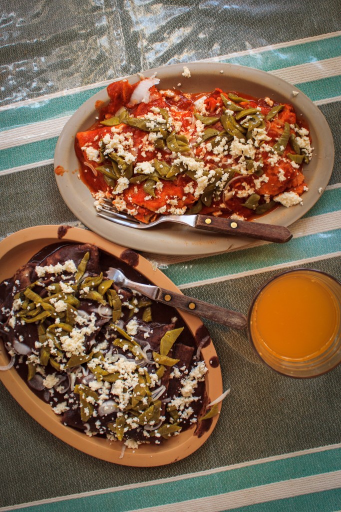 Back in Etla, Andrea’s other cheese, queso fresco, the Latin American cousin of ricotta and feta, is used liberally on the quesadillas at the stall nearby. A group of women sit around the large stove where the proprietor skilfully flattens the blue-corn dough, spreading bean paste and freshly shaven cactus (known as nopales) on top. The customers, all seated on mismatched, colourful plastic stools choose their toppings – meat is always popular with chicken and pork vying for top spot. Courgette flowers and cubed pumpkin are also available for a lighter bite.